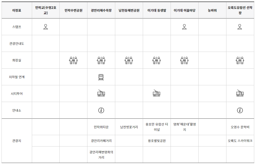 | 광안리해수욕장 | 이기대 | 오륙도 | 스카이워크 | 민락수변공원 | 남천벗꽃거리 |